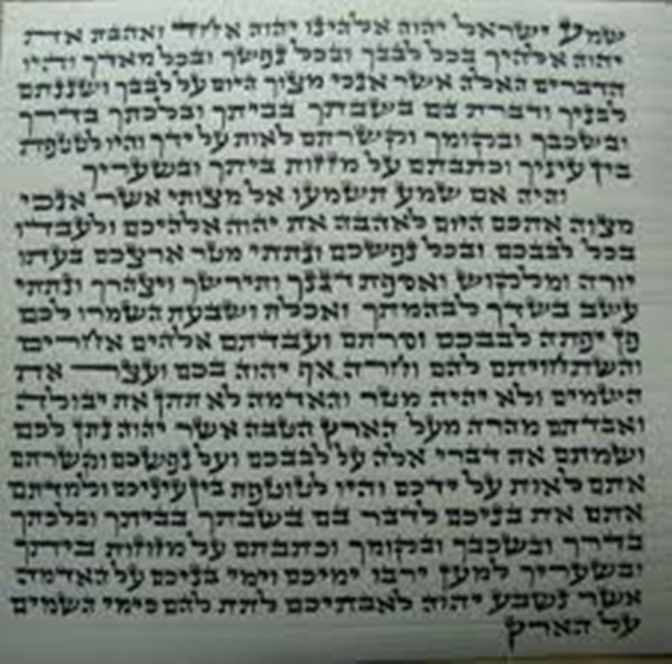 Тфілін (сувій). Тфілін є двома маленькими чорними коробочками, в які покладено крихітні сувої пергаменту з чотирма уривками з Тори: «Присвяти Мені кожного первістка... із синів Ізраїлю...» (Шмот, 13:1-10); «І буде, коли Всевишній приведе тебе в землю Ханаанську, як клявся Він тобі та батькам твоїм...» (Шмот, 13:11-16); «Слухай, Ізраїлю: Господь - Бог наш, Господь один!..» (Дваримо, 6:4-9); «І буде так: якщо послухаєтеся Моїх наказів, які Я даю вам сьогодні...» (Дваримо, 11:13-21).